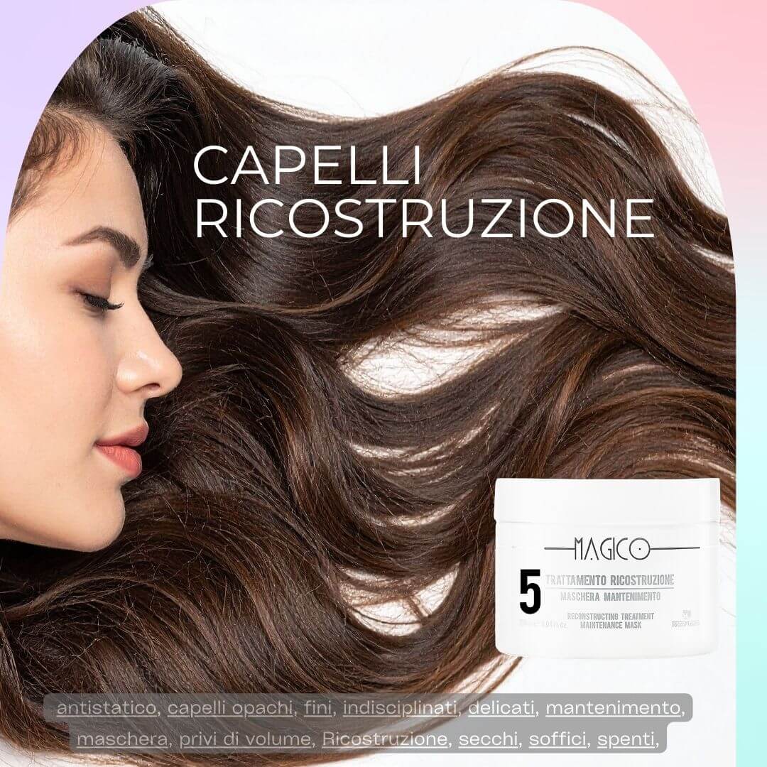 Dopo aver lavato i capelli con il suo Shampo mantenimento e aver risciacquato, applicare la maschera, distribuire sui capelli con lโausilio di un pettine a denti larghi e massaggiare delicatamente.