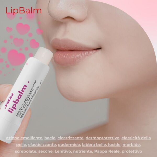 Successivamente procedere con LIPBALM – balsamo labbra, il quale contribuisce a formare una barriera di superficie per proteggere e nutrire in profonditร le labbra