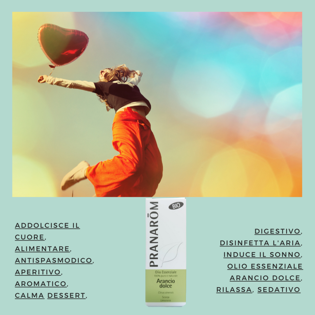 L’olio essenziale di Arancio dolce , alimentare, dona positivitร  e riequilibra, questo olio calma le tensioni e trasmette buon umore e ottimismo. Il suo profumo dolce e fruttato, si fonde sottilmente con molti oli, dal sandalo al piccante.