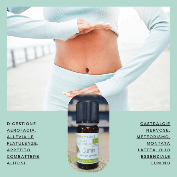 Dai frutti del Cuminum cyminum (Umbelliferae), si estrae un olio essenziale che ha come componente predominante l’aldeide cuminica (35%); sono anche contenuti pinene, terpinene, cimene, fellandrene, cineolo. Svolge una significativa azione regolatrice della funzionalitร gastrointestinale in quanto stimola la secrezione gastrica, facilitando la digestione, e ha azione antispasmodica, elimina i gas intestinali, seda coliche e crampi addominali, anche di origine nervosa.