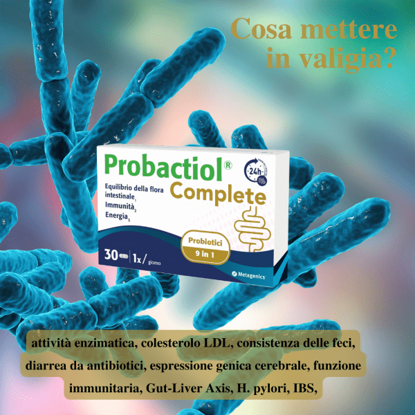 Probactiol® Complete contiene 9 ceppi probiotici in un’unica capsula, con una combinazione di 28 miliardi di batteri vivi e vitali, vitamina D per sostenere la normale funzione del sistema immunitario e vitamina B2 che contribuisce al mantenimento di membrane mucose normali, come quelle dell’intestino. Probactiol® Complete contiene vitamine B1 e B2 che contribuiscono al normale metabolismo energetico.