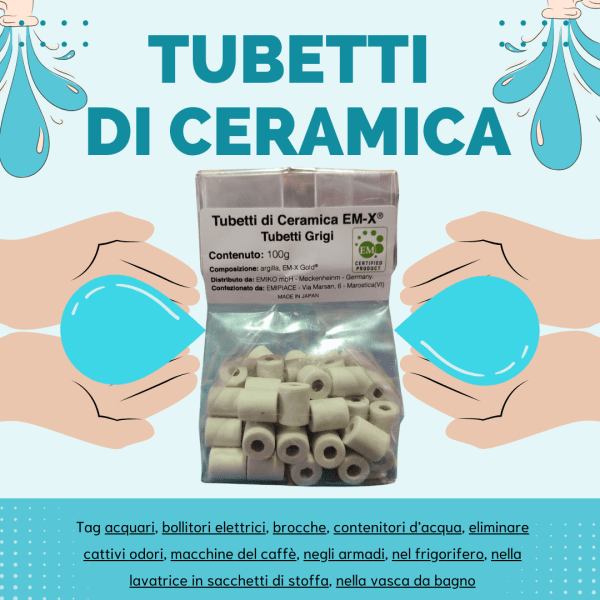 Esempi d’utilizzo: porre i tubi grigi a base di ceramica EM-X® in contenitori d’acqua, brocche, bollitori elettrici, macchine del caffè, acquari, vasi di fiori, nella lavatrice in sacchetti di stoffa, nella vasca da bagno.